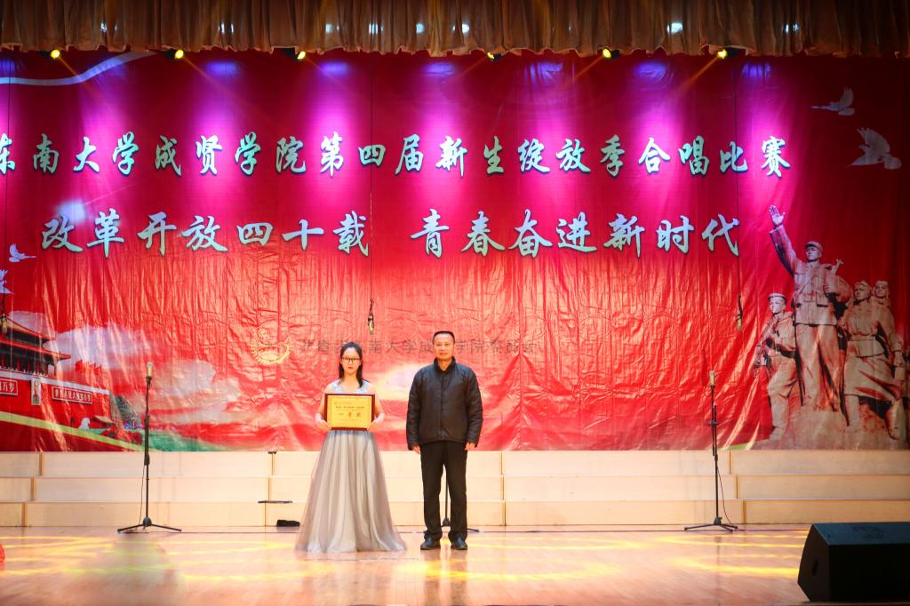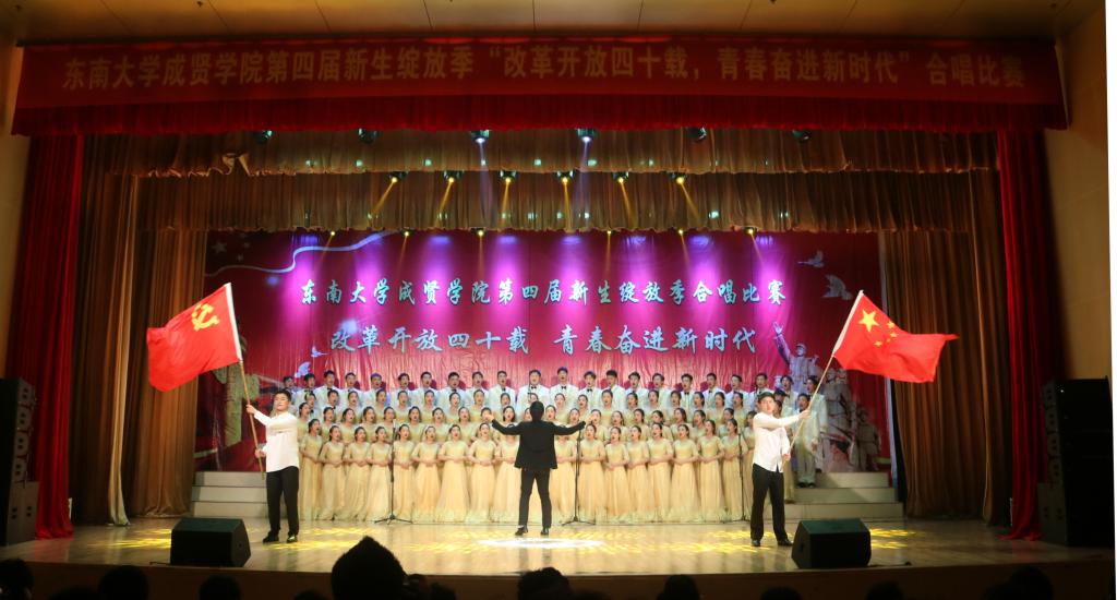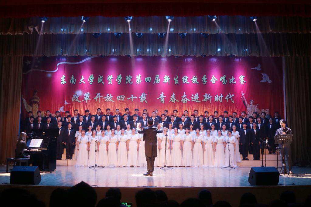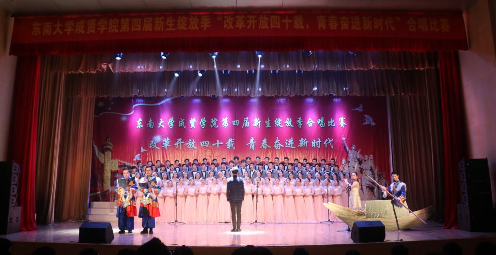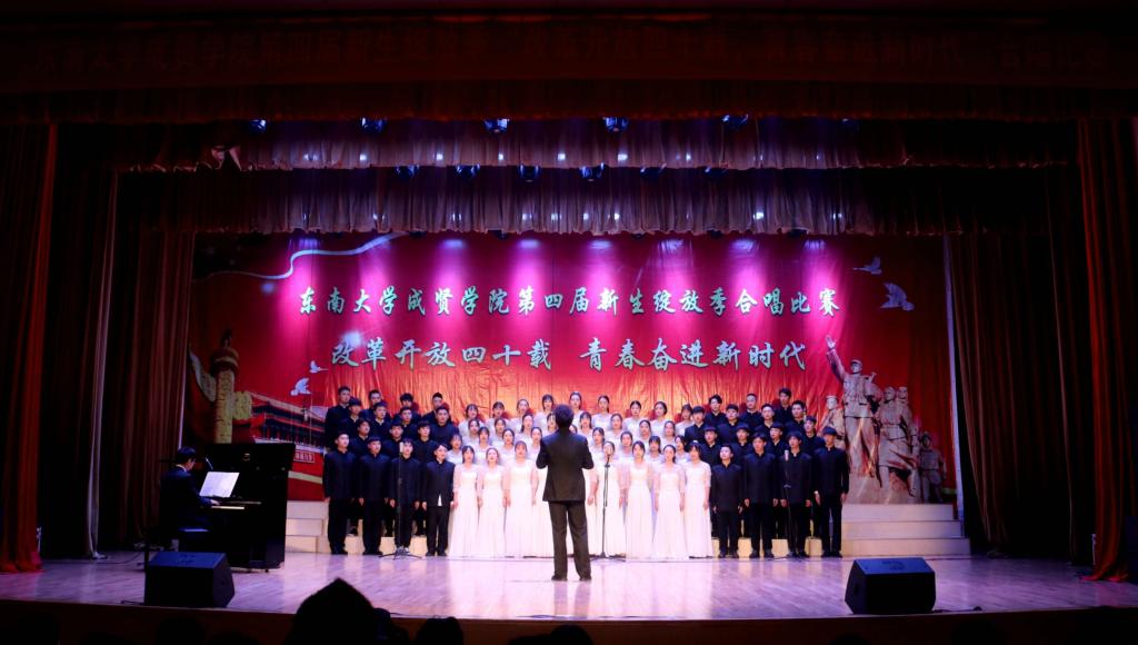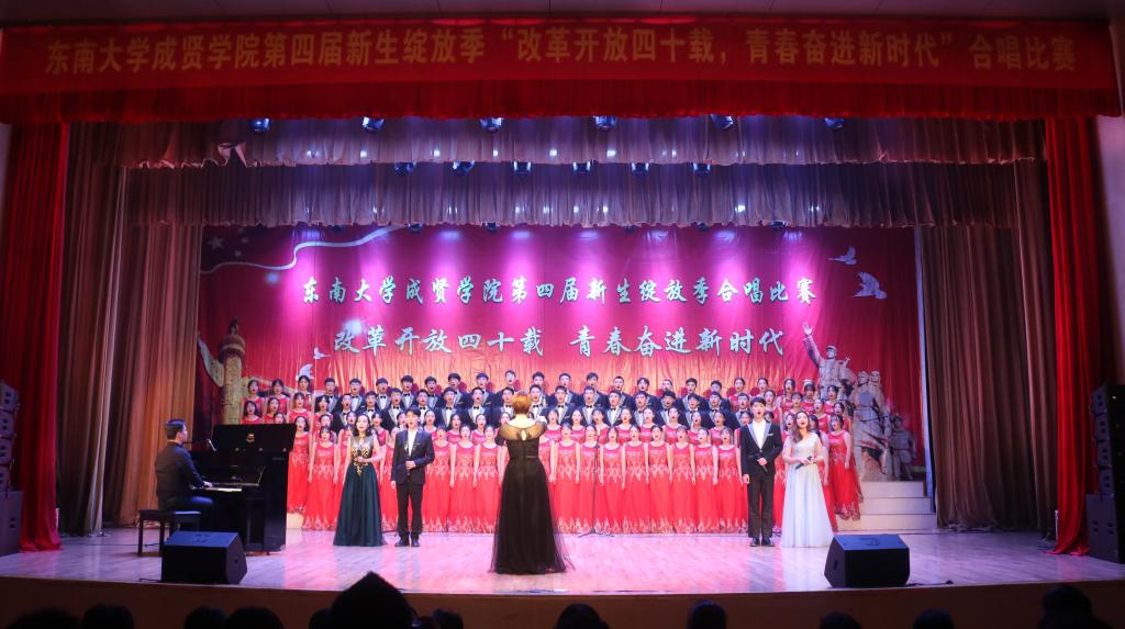 比赛中,大学生艺术指导中心音乐团倾情演绎歌曲《望春风》,展现了经典民谣的优美旋律;各学院老师积极参与指导与演出,师生们通力合作,用铿锵有力、激昂向上的歌声引发了观众对改革开放四十周年来伟大变革的共鸣,充分表达出成贤学子更加坚定走中国特色社会主义道路、改革开放道路的信心与决心。比赛在全场齐唱雄壮的《520夫妻 校歌》声中圆满结束。