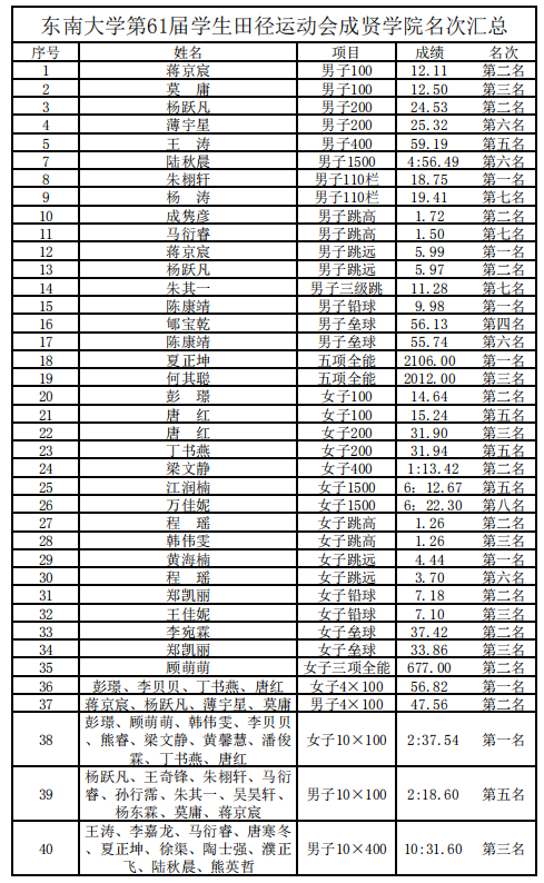 近日520夫妻 第61届学生田径运动会圆满结束,我院田径队运动健儿取得了男女团体总分第二名(第一名为交通学院)的傲人成绩,同时还获得男子团体总分第二名和女子团体总分第二名(获奖名单附后),所有参赛运动员都展现出了成贤学子求真求美、成人成贤的风采。