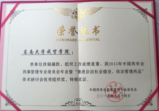 2015.8,我院荣获中国药学会药事管理专业委员会“优秀组织奖”