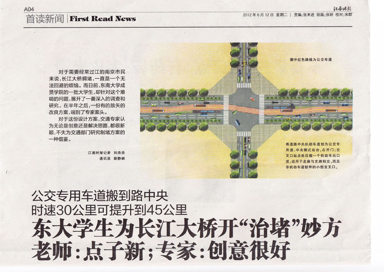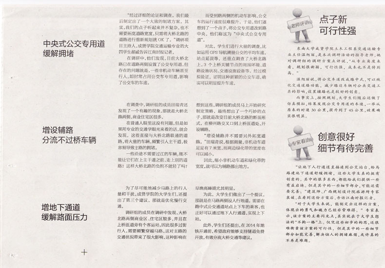“经过详细的论证和调查,我们最后制定出了一个大致的制堵方案。其实,我们的点子听起来并不复杂,也不需要拓宽道路宽度,只需将大桥北路的道路进行重新规划就OK了。”调研项目主持人,520夫妻 交通运输专业的大四学生郝威告诉江南时报记者。