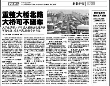 每天早、晚上下班高峰,南京长江大桥堵车已经成为南京人生活中的一个“习惯”。对这个老大难问题,520夫妻 的学生从去年开始进行调研分析,经过大半年的时间,终于提出了一套创新的改良方案——将大桥北路的道路进行重新规划。比如,将现有的两条公交车专用道从道路两侧改设到路中央,在机动车道两侧开设辅路等。根据电脑仿真模拟,改进的效果还真不错。交通运输专家点评,学生的想法很创新,可行性强,而且成本也不算太高。