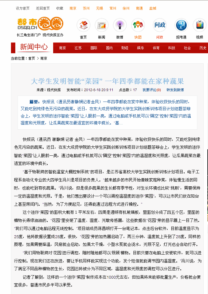 【现代快报都市圈圈网】大学生发明智能“菜园” 一年四季都能在家种蔬果