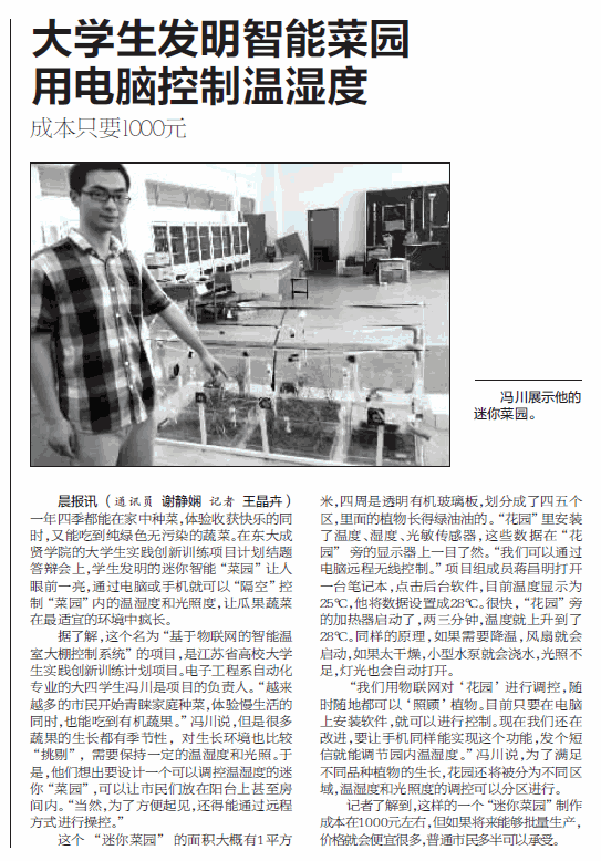 据了解,这个名为“基于物联网的智能温室大棚控制系统”的项目,是江苏省高校大学生实践创新训练计划项目。电子工程系自动化专业的大四学生冯川是项目的负责人。“越来越多的市民开始青睐家庭种菜,体验慢生活的同时,也能吃到有机蔬果。”冯川说,但是很多蔬果的生长都有季节性,对生长环境也比较“挑剔”,需要保持一定的温湿度和光照。于是,他们想出要设计一个可以调控温湿度的迷你“菜园”,可以让市民们放在阳台上甚至房间内。“当然,为了方便起见,还得能通过远程方式进行操控。”