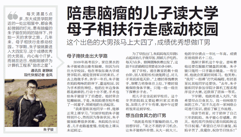 【现代快报】陪患脑瘤的儿子读大学 母子相扶行走感动校园