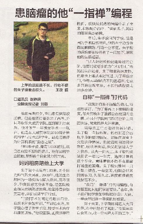 【金陵晚报】患脑瘤的他“一指禅”编程