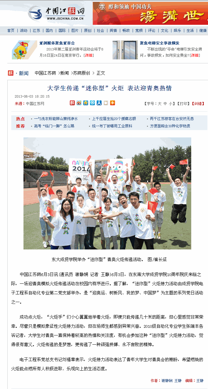 【中国江苏网】大学生传递“迷你型”火炬 表达迎青奥热情