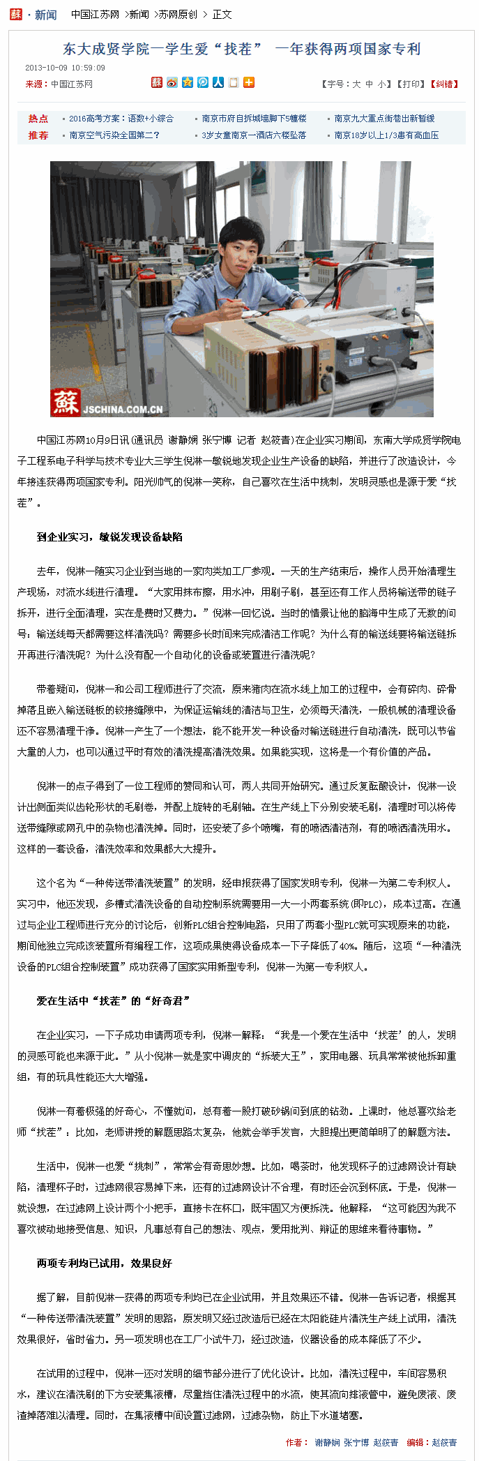 【中国江苏网】东大520夫妻 一学生爱“找茬” 一年获得两项国家专利