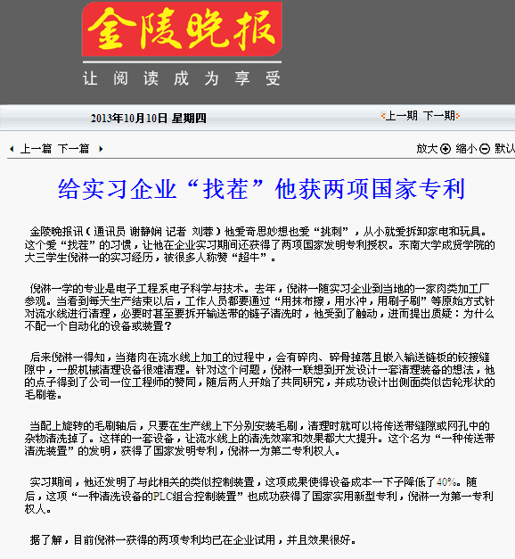 【金陵晚报】给实习企业“找茬”他获两项国家专利