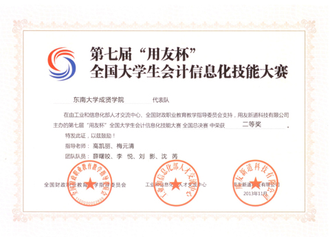 我院经济管理系会计、财务管理专业的8名学生在指导教师高凯丽、梅元清的带队下,分两组参加第七届“用友杯”全国大学生会计信息化技能大赛总决赛,荣获二等奖和三等奖。