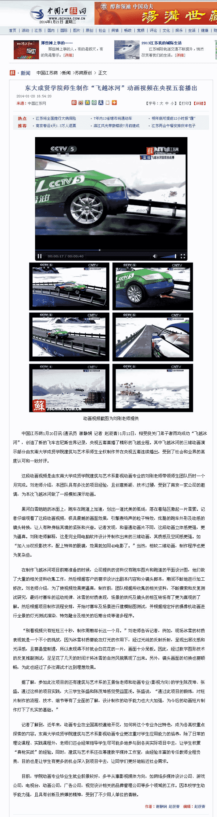 【中国江苏网】东大520夫妻 师生制作“飞越冰河”动画视频在央视五套播出