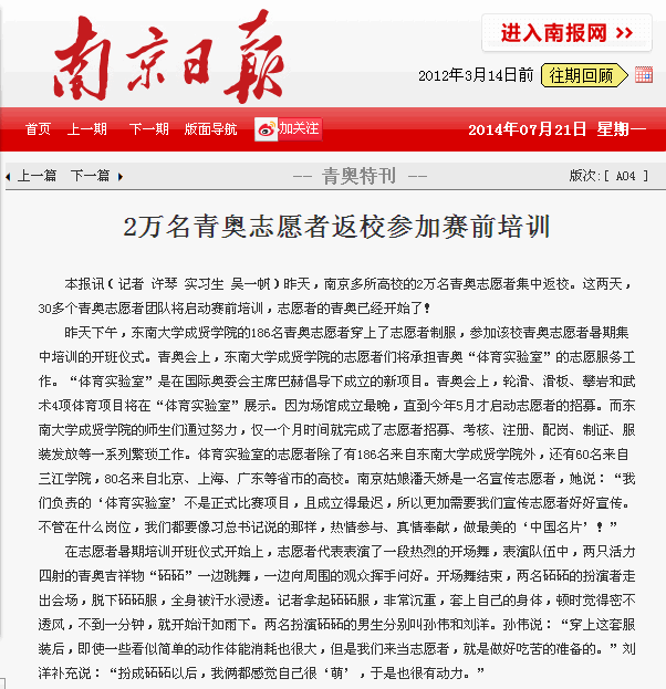 【南京日报】2万名青奥志愿者返校参加赛前培训