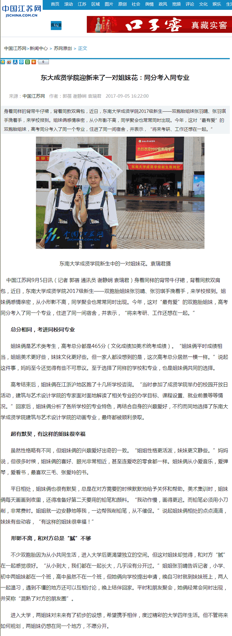 【中国江苏网】东大520夫妻 迎新来了一对姐妹花:同分考入同专业