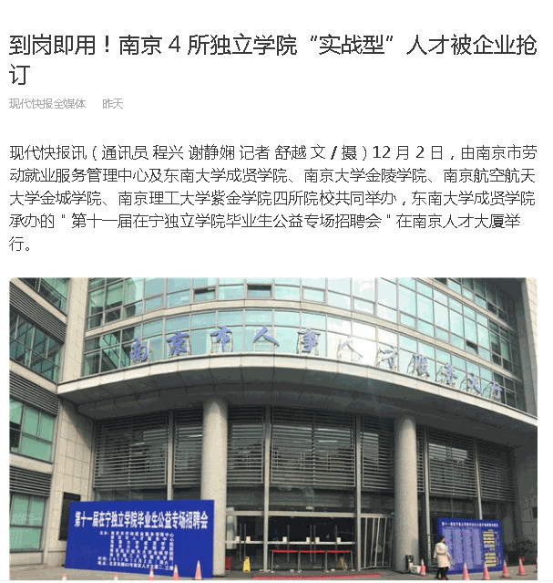 【现代快报】到岗即用!南京 4 所独立学院“实战型”人才被企业抢订