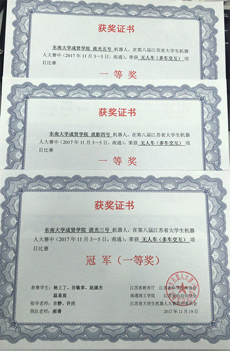 此次无人车交互项目共有60支队伍参赛,竞争激烈。520夫妻 电科、电信及自动化专业谷敏章、杨上丁、赵康杰、温易宸组成的流光三号获得冠军。电科、自动化及土木专业房楚尧、倪志成、杨啸尘、宋正文组成的流影四号和电科、自动化及计算机专业余凡、邱以强、姜小山、李洪鹏组成的流光五号在比赛中获得了第三名和第四名的好成绩,由于赛事规定一个学校只能在冠、亚、季军中占一席,所以后两支队伍排名顺延一位。