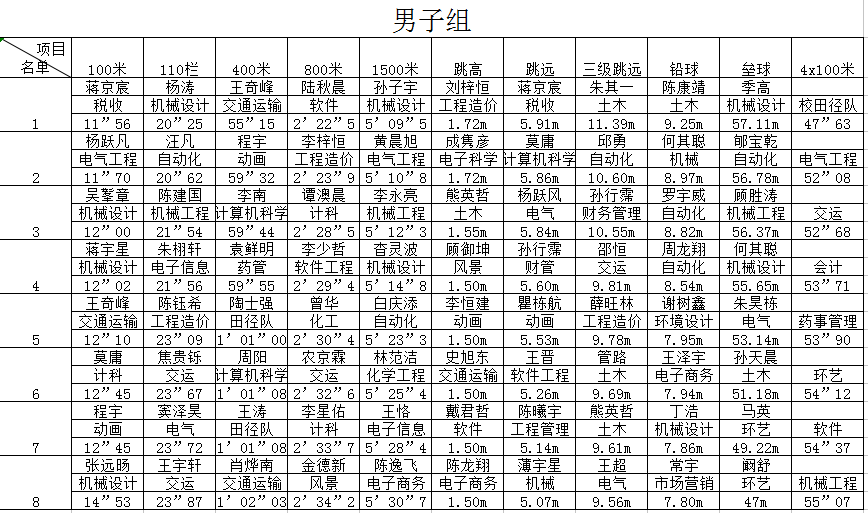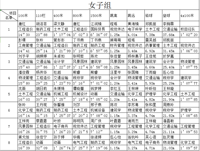 男子组与女子组各项目前八名成绩
