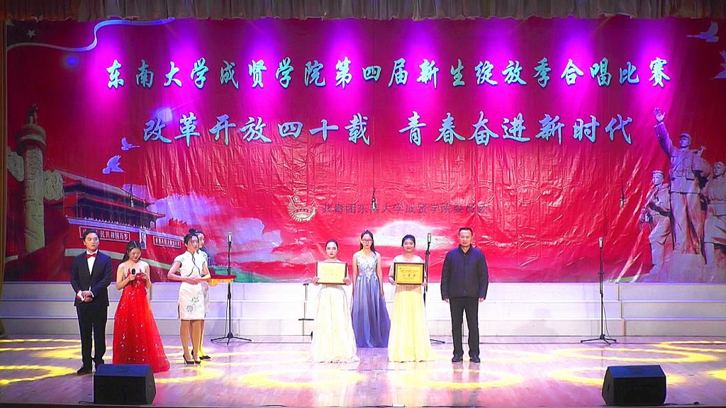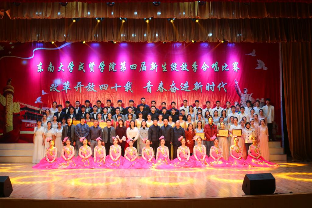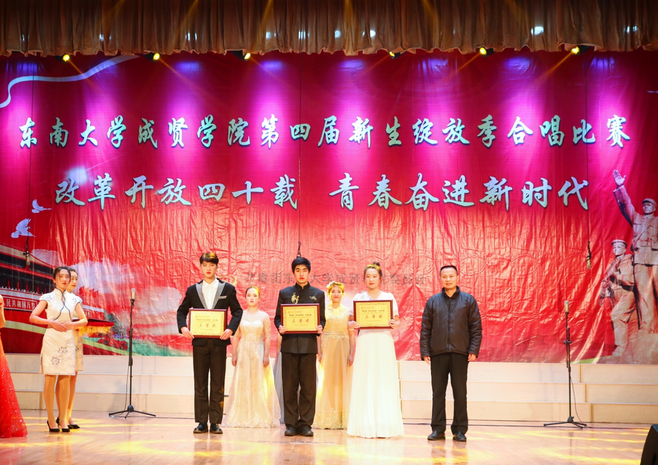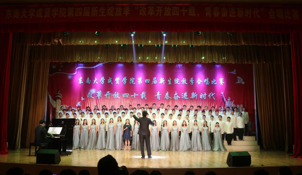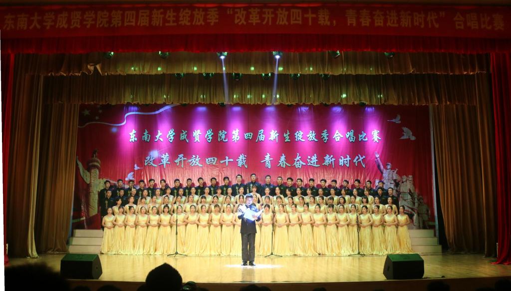 比赛中,大学生艺术指导中心音乐团倾情演绎歌曲《望春风》,展现了经典民谣的优美旋律;各学院老师积极参与指导与演出,师生们通力合作,用铿锵有力、激昂向上的歌声引发了观众对改革开放四十周年来伟大变革的共鸣,充分表达出成贤学子更加坚定走中国特色社会主义道路、改革开放道路的信心与决心。比赛在全场齐唱雄壮的《520夫妻 校歌》声中圆满结束。
