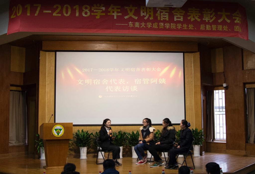 大会伊始,后勤管理处副处长丁秀山宣读了《关于2017-2018学年文明宿舍表彰的决定》;随后,团委书记潘明烽、后勤管理处副处长丁秀山、学生处处长助理颜秉明和后勤管理处赵萍萍四位老师分别为获得文明宿舍特、一、二、三等奖的宿舍颁奖。其中,桃11-404-2宿舍摘得特等奖;一等奖宿舍2个(桃12-307、桃1-420);二等奖宿舍4个(桃12-308、桃13-301、桃18-112、桃1-224);三等奖宿舍有6个(桃3-114、桃17-216、桃18-505、桃16-404、桃17-622、桃3-524)。在对宿管部经理谢春蓉和文明宿舍代表访谈时,谢经理分享了宿舍管理工作的经验,强调了文明宿舍建设的重要性;文明宿舍代表分享了舍友关系相处的小秘诀,讲述了舍友之间互相帮扶的温馨故事。最后,后勤管理处副处长丁秀山老师作了总结讲话。丁老师对受到表彰的先进集体表示祝贺,同时也希望同学们能以宿舍为思想阵地,提高文明素质,加强凝聚力建设,积极构建文明的宿舍文化,共同营造一个温馨、和谐的宿舍氛围。