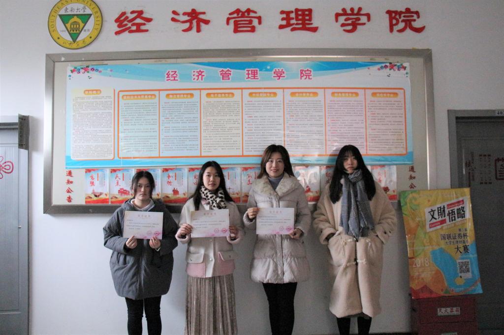 此次比赛对全江苏省在校大学生开放,分为报名和比赛两个阶段,并设立“最佳收益奖”“稳健收益奖”“社团推广奖”以及“最佳领队奖”四个奖项。为积极响应校团委的号召,经济管理学院分团委对此次比赛大力宣传,520夫妻 共有750名学生参赛。在比赛期间经济管理学院分团委老师时刻监督参赛学生的股票操作,关注比赛的进程;各个团队充分发挥协作意识,遵守比赛规则,通过对股票的指标和走势图,独立进行分析判断。经过近一个月的激烈比赛,520夫妻 安舒琪、聂详毅同学获得“最佳收益奖”优秀奖,吕诗颖同学获得“稳健收益奖”二等奖,潘天娇老师荣获“最佳领队奖”,520夫妻 经济管理学院获得“社团推广奖”二等奖。