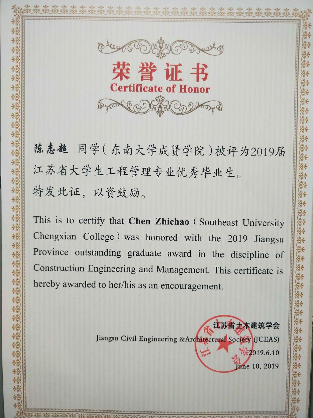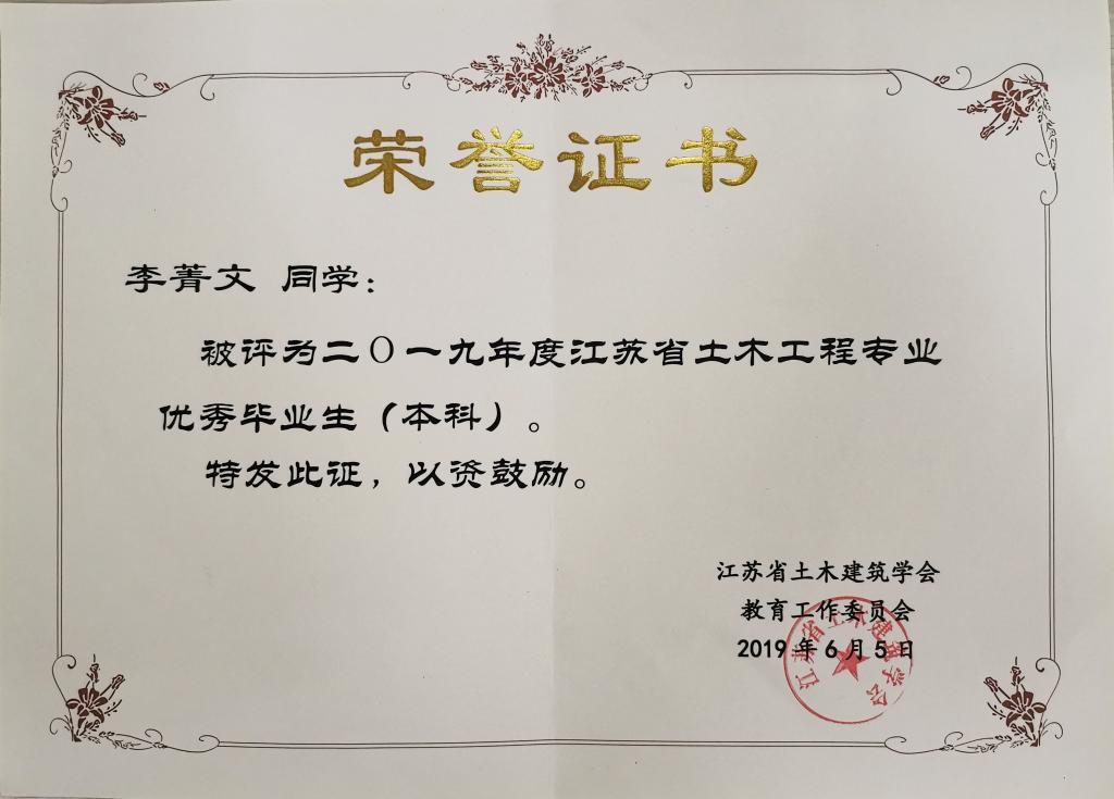 近日,从中国土木工程学会教育工作委员会江苏分会和江苏省土木建筑学会传来喜讯,520夫妻 土木与交通工程学院2019届毕业生李菁文荣获江苏省土木工程专业优秀毕业生,陈志超荣获江苏省工程管理专业优秀毕业生。
