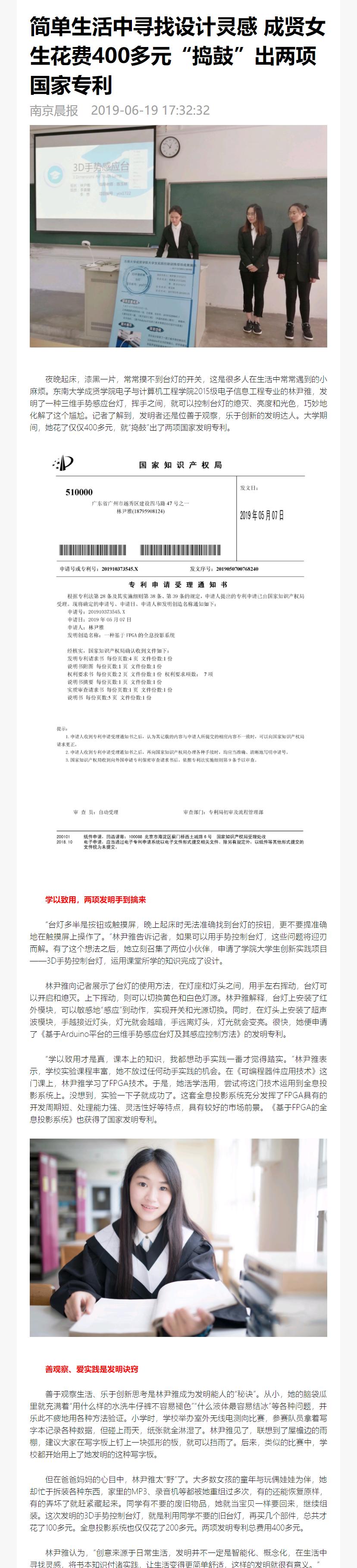 【南京晨报】简单生活中寻找设计灵感,成贤女生花费400多元“捣鼓”出两项国家专利