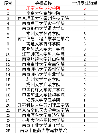 2019年江苏省独立学院一流专业统计