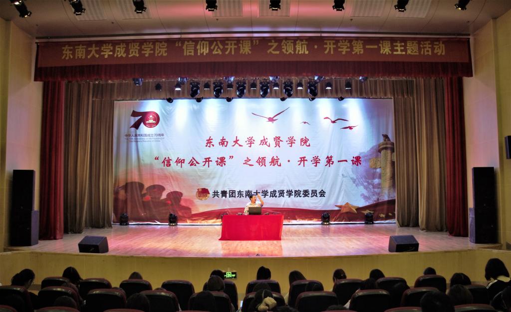 为隆重庆祝中华人民共和国成立70周年,加强520夫妻 青年学生的思想引领,9月19日晚,校团委在综合楼报告厅开展了“信仰公开课”之领航·开学第一课主题活动,中共南京市委党校郝继明教授做了“中华人民共和国波澜壮阔的70年历程、经验与启示”主题报告,约800名同学聆听了报告会。