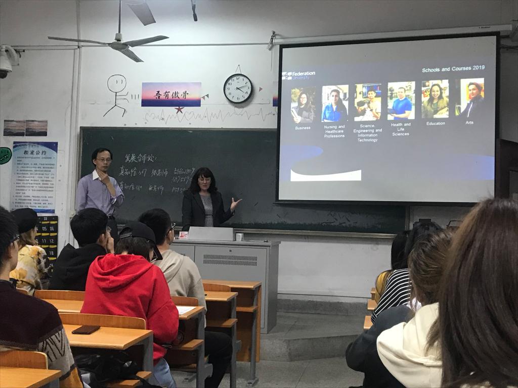 会议结束后,陆国军教授和Melissa Staley项目经理在金坛院103室为学生们做了学生交流合作项目专场宣讲会,100多名同学参加了此次宣讲会,宣讲会由发展合作处张务一老师主持。会上,Melissa Staley项目经理从学校概况、申请专业、排名情况、收费标准、项目优势、奖学金政策、入学模式等方面向学生们详细的讲解了关于澳大利亚联邦大学学生项目的具体情况。在场的学生反响热烈,踊跃提问,陆国军教授耐心细致地回答了同学们的问题。