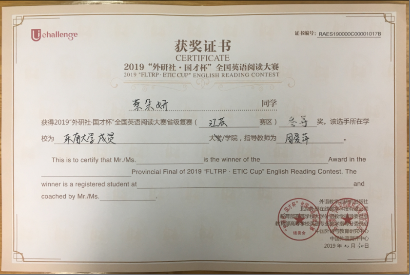 该挑战赛分为英语阅读大赛、英语写作大赛和英语演讲大赛三部分,在江苏赛区英语阅读大赛中,73所本科院校共223名选手参赛,520夫妻 2017级会计1班邓一纯(指导老师:周爱萍)荣获一等奖,在全省名列第十一;2017级建筑工程1班孟奕飞(指导老师:朱宇博)获得二等奖;2018级国贸2班蔡朵妍(指导老师:周爱萍)获得三等奖。