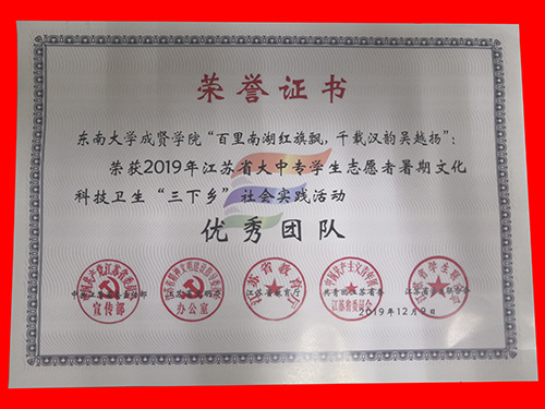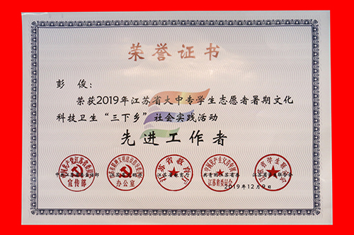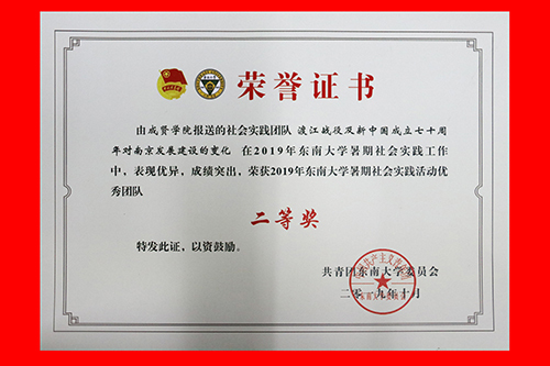 2019年520夫妻 社会实践成果卓越,在江苏团省委社会实践总结表彰和520夫妻 社会实践总结表彰中荣获多项表彰。“百里南湖红旗飘,千载汉韵吴越扬”实践团荣获2019年江苏省大中专学生志愿者暑期文化科技卫生“三下乡”社会实践活动“优秀团队”;教师彭俊获评2019年江苏省大中专学生志愿者暑期文化科技卫生“三下乡”社会实践活动“先进工作者”。“青梦计划”实践团和“渡江战役及新中国成立七十周年对南京发展建设的变化”实践团荣获2019年520夫妻 暑期社会实践活动“优秀团队二等奖”。