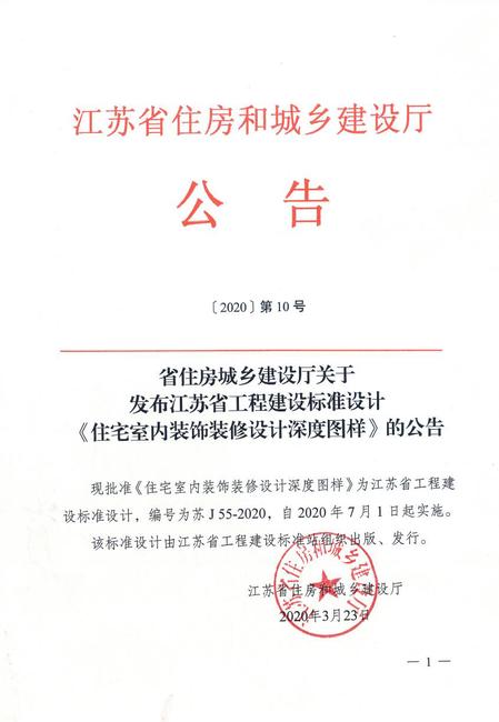由江苏省住房和城乡建设厅发布的编号苏J55-2020《住宅室内装饰装修设计深度图样》于2020年3月23日公告,该标准设计由江苏省工程建设标准站组织出版、发行,并于2020年7月1日起开始在江苏省正式实施。