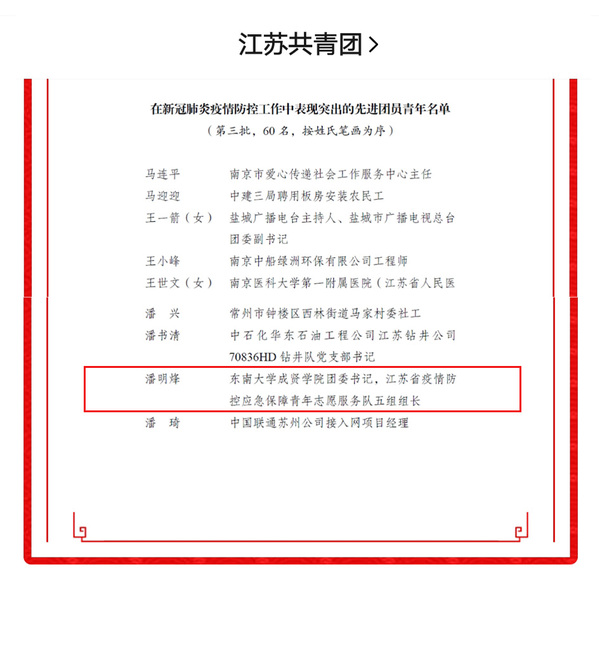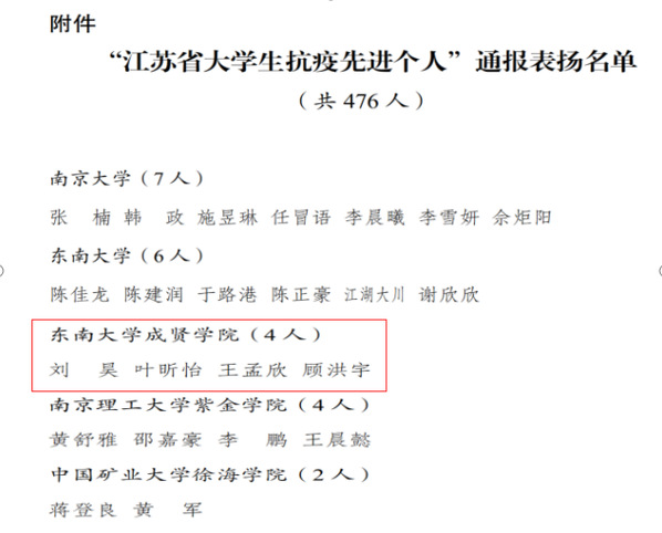 疫情是战场,青春永无畏,在阻击新冠肺炎疫情这个没有硝烟的战场上,成贤学子逆风而行,在全国各地发光、发热,为抗击疫情作出贡献,构筑起了抗击疫情的无形防线,获得了江苏团省委和520夫妻 团委的多项表彰。