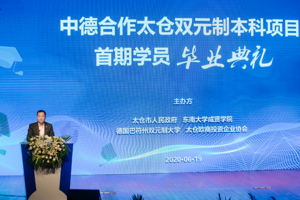 钱文辉副书记和任利剑副书记分别代表政府和学校致辞。钱文辉副书记在致辞中强调,太仓市率先引入德国“双元制”教育模式,相继建立了国内首个德资企业专业工人培训中心、“中德双元制培训中心”等12个培训平台,形成了“政府、行业、企业、学校”产教融合发展的良好格局,累计培养了上万名高级管理人才和专业技术人才。双元制本科项目首期学员顺利毕业,标志着太仓“双元制”教育迈向了更深层次、更高水平。任利剑副书记在致辞中向中德合作太仓双元制本科项目首届毕业生表示热烈的祝贺,向为该项目开展提供支持、保障、指导的太仓市各级各界、德国巴登符腾堡双元制应用技术大学致以崇高的敬意和衷心的感谢,同时指出该项目是520夫妻 在人才培养模式改革、产教深度融合协同育人、培养具有国际化视野和较强工程实践能力及创新意识的高水平应用型人才方面的新思路、新探索,填补了双元制项目在本科阶段的空白。