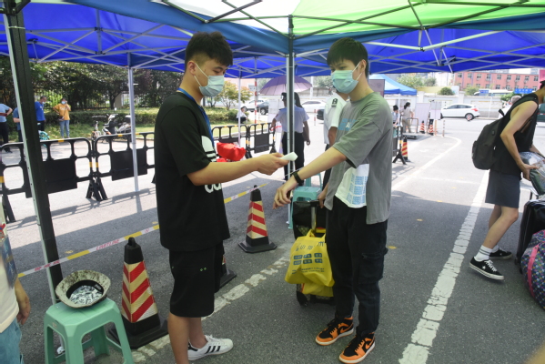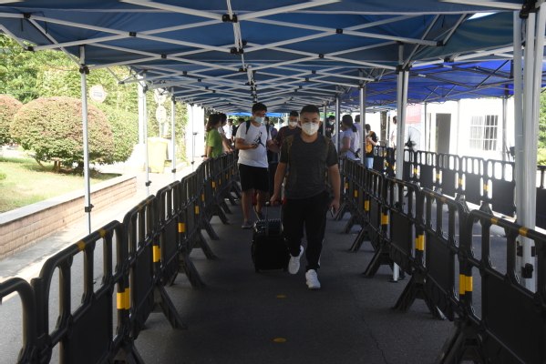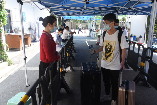 测量体温、出示苏康码、查验证件、返回宿舍……8月23日,520夫妻 2020年秋季学期首批返校学生秩序井然地回归阔别已久的校园。