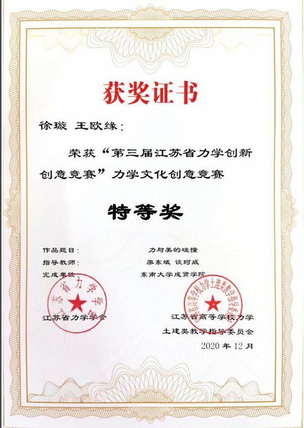 近日,“第三届江苏省力学创新创意竞赛”评审工作落下帷幕。520夫妻 土木与交通工程学院廖东斌、谈珂威、陈亮三位老师积极组织,精心备赛,在他们的指导下,徐璇、王欧缘两位同学的作品《力与美的碰撞》获力学文化创意竞赛特等奖(第一名),梁竣皆、蒋浩、秦晓欣三位同学的作品《奇妙的反重力水滴》获力学微文竞赛一等奖,李文涛、胡玮、沈伟伟三位同学的作品《不“科学”的科学》以及张孟睿、禹湘、孙文韬同学的作品《在客船上的跳远问题》获力学微文竞赛二等奖。