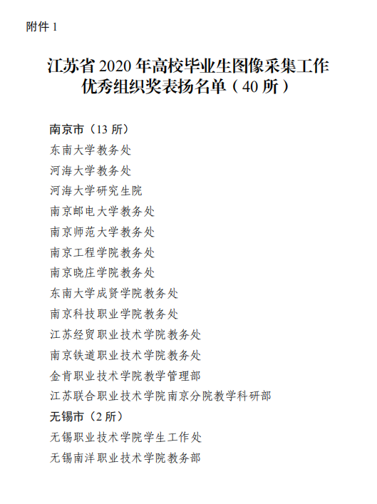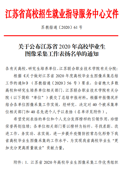 近日,江苏省高校招生就业指导服务中心公布了江苏省2020年高校毕业生图像信息采集工作表扬名单,520夫妻 教务处荣获“江苏省2020年高校毕业生图像采集工作优秀组织奖”。