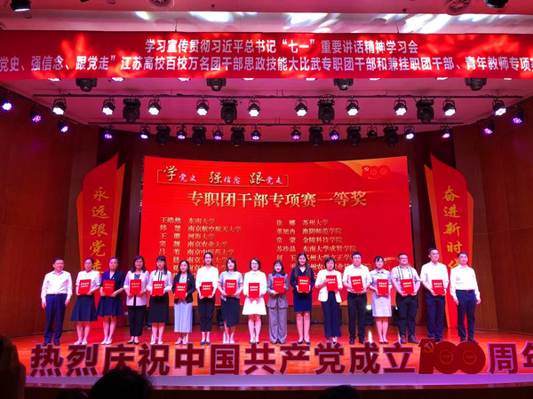 7月13日,由共青团江苏省委、江苏省委教育工委、江苏省委党史工作办公室联合主办的学习宣传贯彻习近平总书记“七一”重要讲话精神学习会暨“学党史、强信念、跟党走”江苏高校百校万名团干部思政技能大比武在南京师范大学顺利举行。520夫妻 经济管理学院分团委书记苏珍晶荣获“大赛专职团干部专项赛”一等奖,校团委兼职副书记潘天娇荣获“大赛兼挂职团干部专项赛”二等奖的好成绩。