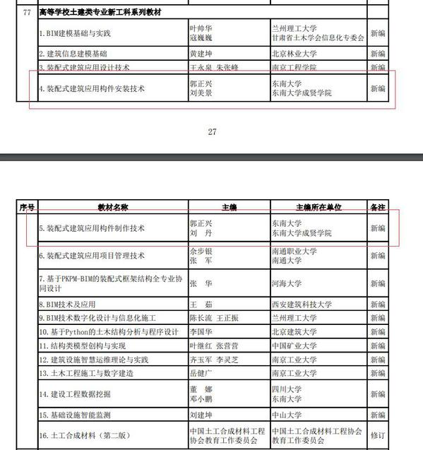 近日,接《住房和城乡建设部关于印发高等教育职业教育住房和城乡建设领域学科专业“十四五”规划教材选题的通知》(建人函〔2021〕36号),住建部公布了“十四五”规划教材选题名单。经过单位申报、专家评审,520夫妻 土木与交通工程学院郭正兴教授、刘美景副教授、刘丹副教授申请的《装配式建筑应用构件安装技术》《装配式建筑应用构件制作技术》2项教材获批。