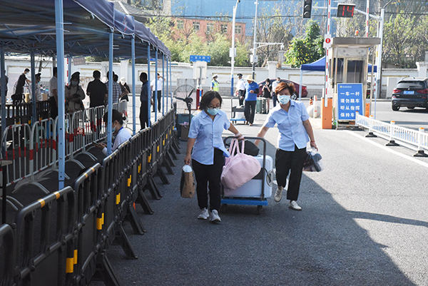 全校各单位通过前期协调会议、防控应急预演等全面科学的准备,现场严密细致地开展学生报到相关工作,层层压实疫情防控工作责任,报到现场井然有序,平稳高效。校党委书记邢纪红,常务副院长许映秋,党委副书记、副院长王荣以及相关部门负责人到现场了解学生报到情况,慰问一线工作人员,并与返校学生亲切交流。学生进校流程清晰,查验健康码、测量体温、核对身份信息等防疫工作按部就班进行;工作人员、志愿者温馨提醒,热情引导,帮助学生迅速完成报到流程,利用小推车、汽车等工具助力,帮助学生搬运行李,省时高效;后勤管理处特准备绿豆汤等解暑饮品为学生解暑降温,多措并举,为学生们提供贴心周到的服务。