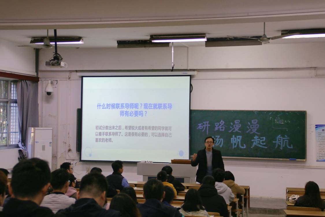 在此次讲座中,张一卫教授为同学们指明了考研之路。首先,张教授讲解了研究生考试的考核形式和考试难度,以520夫妻 、常州大学、南京工业大学的院校招生专业目录为例,强调了专业课程在考研中的重要地位。其次,张教授向同学们分享了考研相关科目的复习方法,依次指出在政治英语和数学三门公共课以及专业课程的复习中需要注意的各个方面。张一卫教授从考生的角度出发,提出了选择导师的三个方面和联系导师的方式。最后,张教授从学习和生活两个方面给同学们提出了真挚的建议,鼓励同学们奋发进取,砥砺前行。
