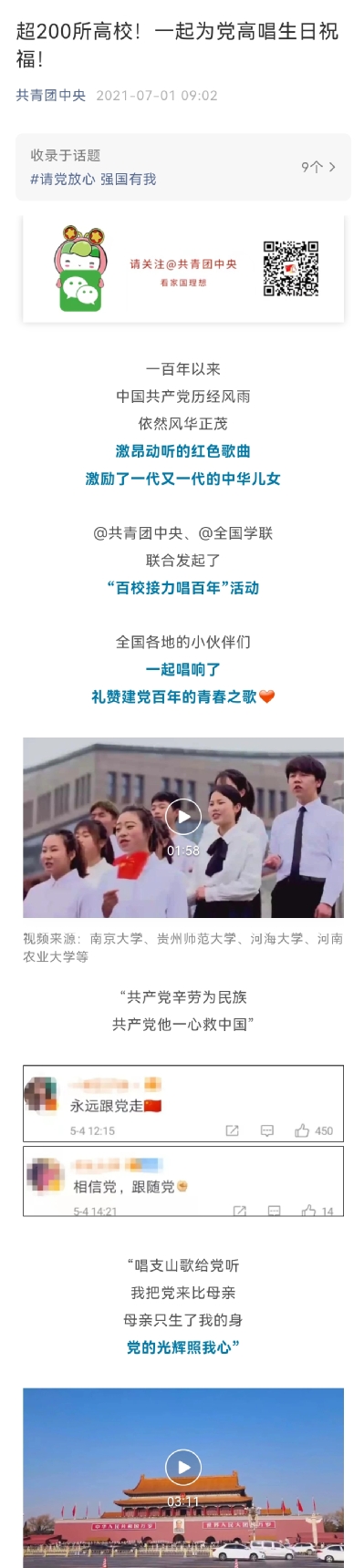 此外,暑假期间校团委响应共青团中央和全国学联联合发起的“百校接力唱百年”活动号召,所报送的《唱支山歌给党听》MV在7月1日庆祝建党100周年当天被“共青团中央”微信公众号宣传报道,同步收录于“请党放心 强国有我”话题。