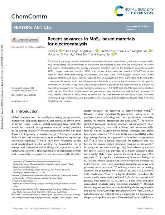 该成果以李锐智同学为第一作者,520夫妻 第一单位,以“Recent Advances in MoS2-based Materials for Electrocatalysis”为题,发表在了国际期刊Chemical Communication 上,制药与化学工程学院孙贻白老师、电子科技大学孙旭平教授为共同通讯作者。
