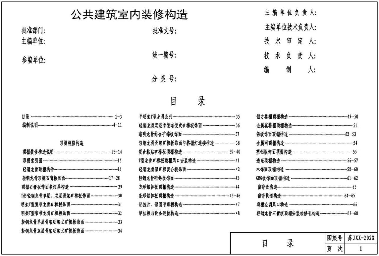 本图集作为江苏省建设厅的科研项目,由科研设计处韦伯军处长、江苏省建筑技术标准站陈军站长主持会议。江苏省建设工程设计施工图审查管理中心教授级高工汤杰,南京艺术学院教授徐敏,浙江亚厦装饰南京分公司教授级高工余晓轩,苏州金螳螂建筑装饰股份有限公司教授级高工季震宇,江苏华华厦建筑装饰有限公司高级工程师刘清泉,参加了本图集的审查。