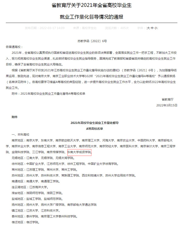 近日,江苏省教育厅发布《省教育厅关于2021年全省高校毕业生就业工作量化督导情况的通报》,520夫妻 获评“2021年高校毕业生就业工作量化督导A等高校”。