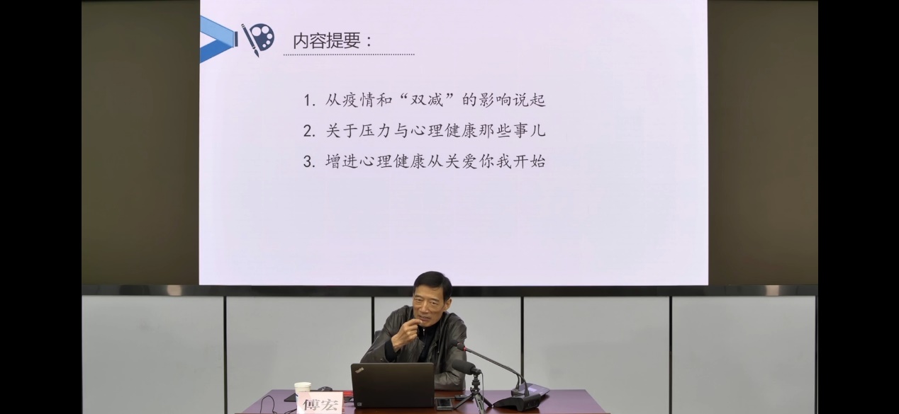 本次的讲座嘉宾是南京师范大学心理学院教授、、中国心理学会注册心理督导师、江苏省“六大人才高峰”项目主持专家、江苏省政协委员傅宏博士。傅教授的讲座分为三个方面:从疫情和“双减”的影响说起,关于压力与心理健康那些事儿,增进心理健康从关爱你我开始。他首先分析了疫情和“双减”政策对教职工心理健康的影响,带领大家找寻压力的来源。随后,他用实际案例向大家传授在压力中找寻减压的方式方法。最后,他指出,压力释放、心理调适要“心得在各人,重点在预防”。