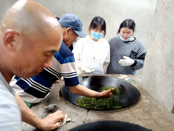 园艺师傅指导同学如何炒制茶叶