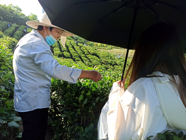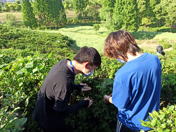 物业朱经理指导学生如何采茶