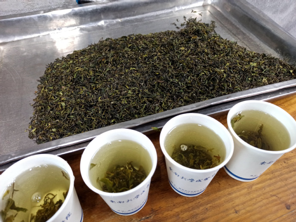 采茶环节结束后,同学们转战来到学校花房,在园艺师傅们的指导下,一步步完成杀青、揉捻、炒干等绿茶加工工序,将采摘的茶叶制成了“成贤春茗”。