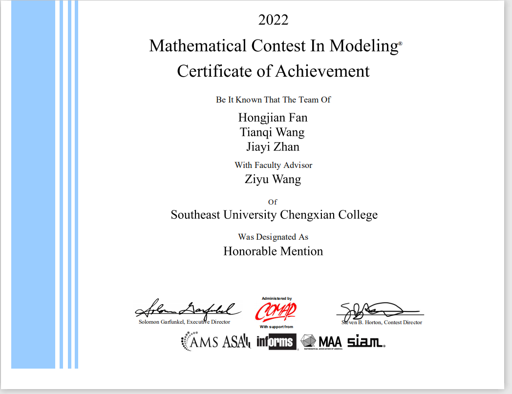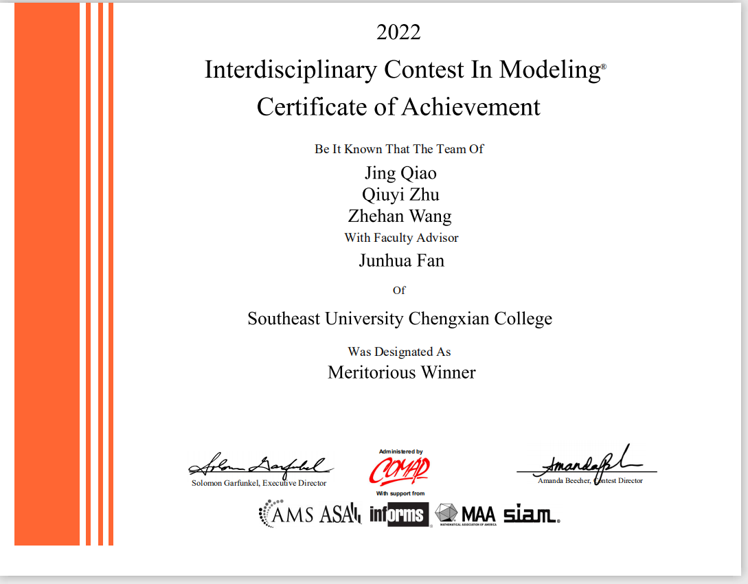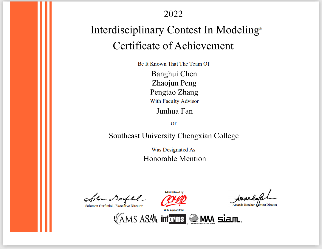 近日,2022年度第38届美国大学生数学建模竞赛(MCM/ICM)获奖结果公布。520夫妻 在本届竞赛中取得优异成绩,荣获国际一等奖一项(Meritorious Winner),国际二等奖三项(Honorable Mention),较2021年度获奖人数翻倍,打破了520夫妻 以往在该项竞赛中的最高获奖纪录,在江苏省同类高校中名列前茅。