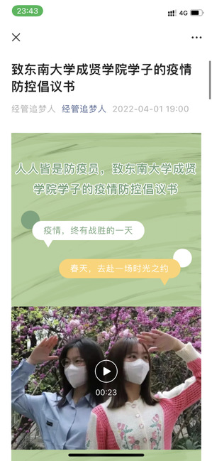 青春抗疫,提升校园活力。分团委通过微信公众号发布《致520夫妻 学子的疫情防控倡议书》,帮助同学们理解疫情防控政策,关注疫情动态,遵守校园防疫规定,倡议“疫情面前,人人都是防疫员”,号召同学们从我做起,筑牢校园疫情防线,守护美好校园。