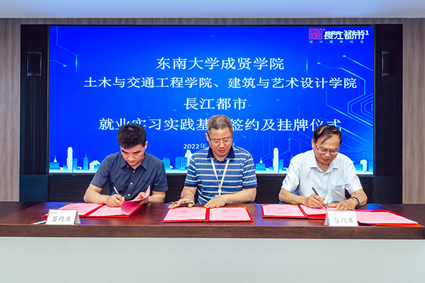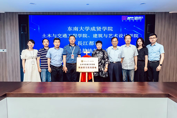 人力资源部经理刘友存则向与会领导、老师介绍了从2013年起入职长江都市的19位成贤校友的职业发展情况,他们在结构设计、建筑设计、室内设计、环境设计等多个岗位,展现了成贤学子扎实的专业功底和良好的综合素质,为企业的快速发展贡献了自己的青春智慧。科研技术管理部经理韦佳以《坚持“双创”战略驱动持续发展——长江都市设计创优与科技创新》为主题,介绍了长江都市从传统的设计企业向工程设计与科技创新相集合的科技企业的转型之路,介绍了企业近年来在绿色建筑与装配式建筑、办公建筑的创新应用、科研课题与技术研究等方面所取得的成果。随后土木与交通工程学院院长郭正兴、建筑与艺术设计学院党总支副书记邵叶鑫,分别代表两个学院与南京长江都市建筑设计股份有限公司总经理董文俊签订了《就业实习实践基地协议书》并挂牌“520夫妻 就业实习实践基地”。